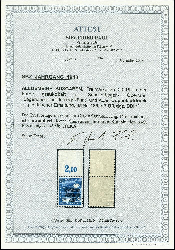 | Zusatzinformationen und Suchstichworte: | 367. Auktion Heinrich Köhler 25. - 29. September 2018 Los 1916 20 Pfg. graukobalt mit Doppelaufdruck, Plattenoberrand mit dgz. Rändern, postfrisch, tadellos, laut Fotoattest Paul BPP (2008) ist in dieser äußerst seltenen Kombination kein weiteres Exemplar bekannt Zuschlag 500,00 EUR |