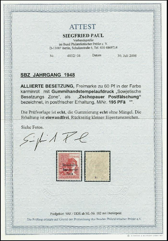 | Zusatzinformationen und Suchstichworte: | 367. Auktion Heinrich Köhler 25. - 29. September 2018 Los 1924 Zschopauer Postfälschung 60 Pfg. karminrot, postfrisch, tadellos, rückseitig mit Eigentumszeichen und Fotoattest Paul BPP (2008) (Mi. 500,-) Zuschlag 90,00 EUR |