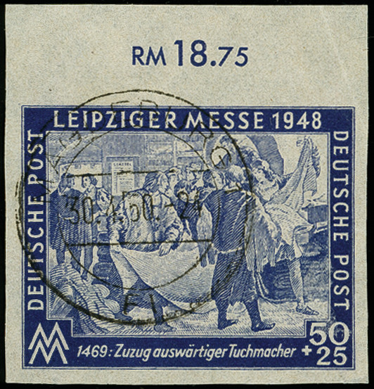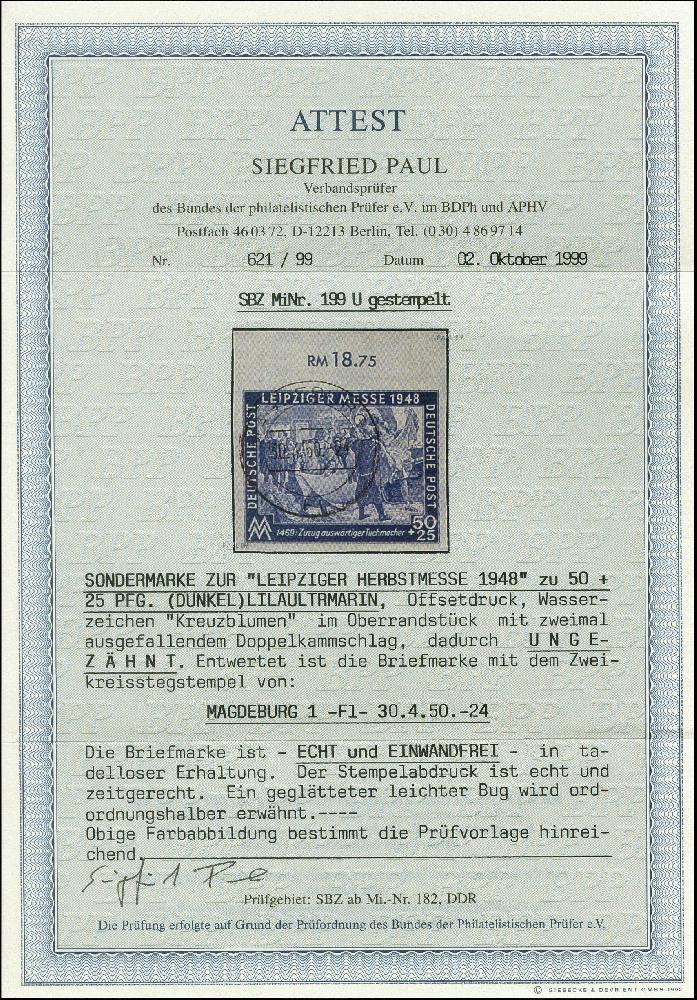 | Zusatzinformationen und Suchstichworte: | 367. Auktion Heinrich Köhler 25. - 29. September 2018 Los 1930 Leipziger Herbstmesse 50 Pfg. ungezähnt, Oberrandstück, sauber gestempelt, geglätteter Eckbug oben rechts ausserhalb des Markenbildes, sonst tadellos, äußerst seltene Marke, Fotoattest Paul BPP (1999) Ausruf 500,00 EUR |