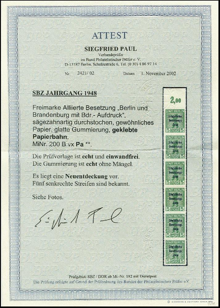 | Zusatzinformationen und Suchstichworte: | 367. Auktion Heinrich Köhler 25. - 29. September 2018 Los 1932 Maschinenaufdruck auf Bären: 5 Pfg. sägezahnartig durchstochen im senkrechten 6er-Streifen vom Oberrand, dabei zwei Werte mit Abart "Druck auf geklebter Papierbahn", postfrisch, tadellos, nur wenige Stück bisher bekannt, Fotoattest Paul BPP (2002) Zuschlag 250,00 EUR |