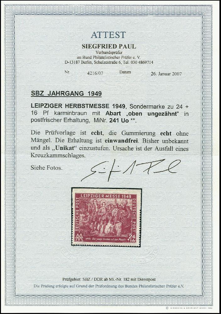| Zusatzinformationen und Suchstichworte: | 367. Auktion Heinrich Köhler 25. - 29. September 2018 Los 1972 1949, Leipziger Herbstmesse 24 Pfg. mit Abart "oben ungezähnt", postfrisch, tadellos, laut Fotoattest Paul BPP (2007) bisher nur dieses Exemplar bekannt, eine große SBZ-Seltenheit (Mi. 3.500,-) Zuschlag 1.000,00 EUR |