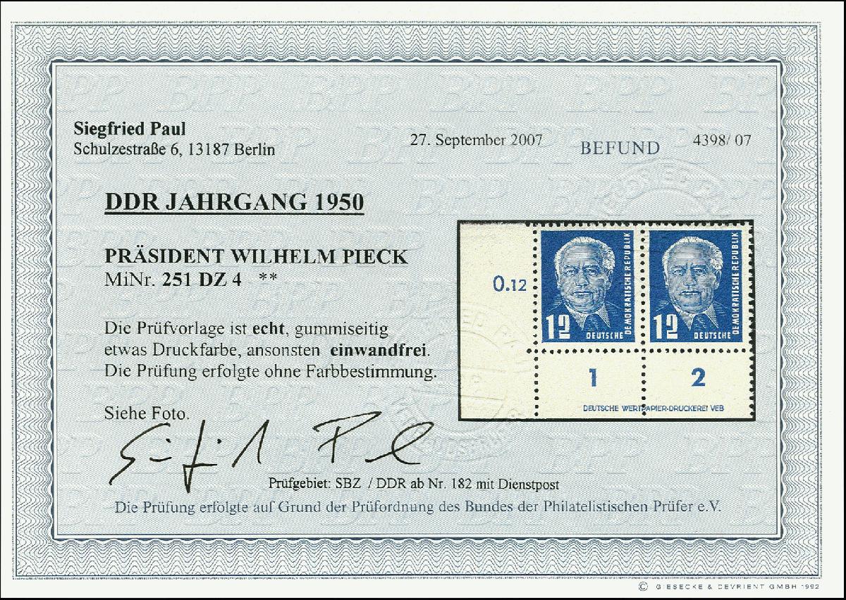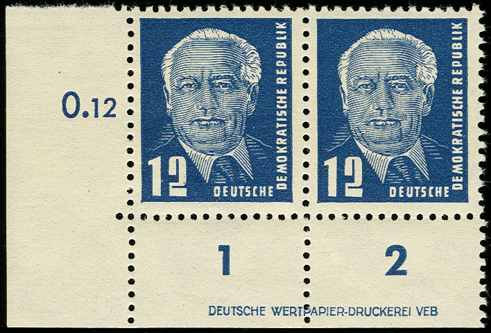 | Zusatzinformationen und Suchstichworte: | 367. Auktion Heinrich Köhler 25. - 29. September 2018 Los 1974 1950, Pieck 12 Pfg. im waagerechten Paar aus der linken unteren Bogenecke mit Druckereizeichen "DEUTSCHE WERPAPIER-DRUCKERREI VEB", postfrisch, tadellos, Fotobefund Paul BPP (2007) (Mi. 600,-) Zuschlag 140,00 EUR |