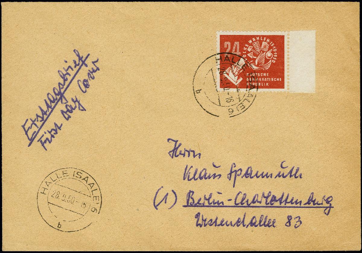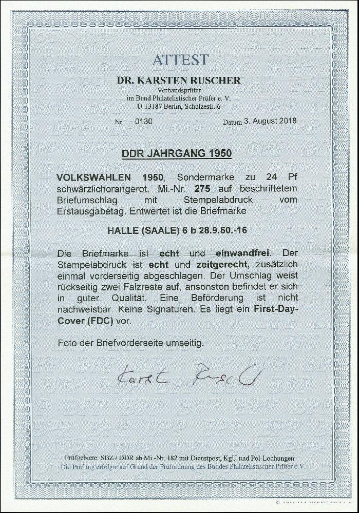 | Zusatzinformationen und Suchstichworte: | 367. Auktion Heinrich Köhler 25. - 29. September 2018 Los 1981A 1950, Volkswahlen 24 Pfg., rechtes Seitenrandstück mit Stempel "HALLE (SAALE) 28.9.50" auf Ersttagsbrief, tadellos, Fotoattest Ruscher BPP (2018) (Mi. 1.000,-) Zuschlag 260,00 EUR |