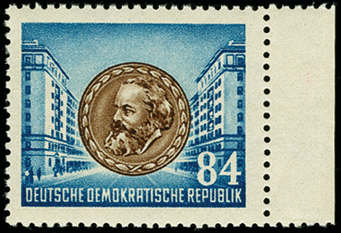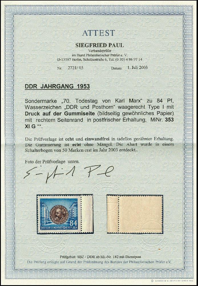 | Zusatzinformationen und Suchstichworte: | 367. Auktion Heinrich Köhler 25. - 29. September 2018 Los 1997 1953, 70. Todestag von Karl Marx 84 Pfg., Randstück mit Abart "Druck auf nicht gestrichenem Papierseite, Gummierung auf gestrichenem Papier", postfrisch, tadellos, unsigniert mit Fotoattest Paul BPP (2003) (Mi. 800,-) Ausruf 150,00 EUR |