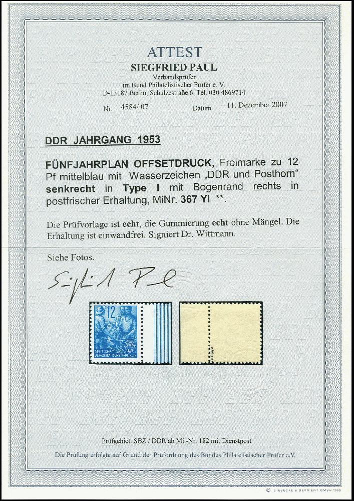 | Zusatzinformationen und Suchstichworte: | 367. Auktion Heinrich Köhler 25. - 29. September 2018 Los 1998 Fünfjahrplan 12 Pfg. mit Wasserzeichen 2 YI, Randstück, postfrisch, tadellos, sign. Dr. Wittmann und Fotoattest Paul BPP (2007) (Mi. 750,-) Zuschlag 260,00 EUR |