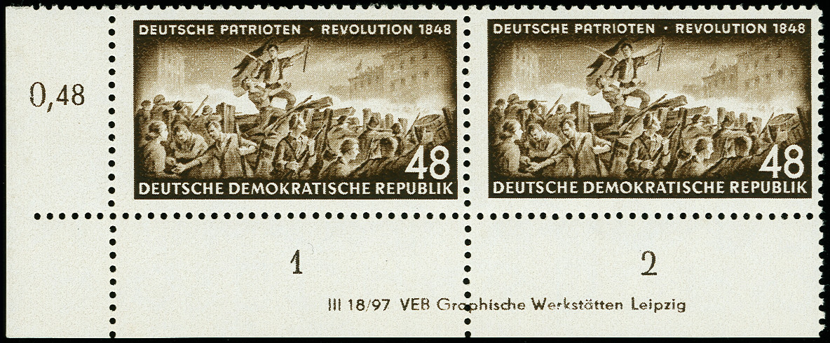 | Zusatzinformationen und Suchstichworte: | 367. Auktion Heinrich Köhler 25. - 29. September 2018 Los 2000 Deutsche Patrioten 48 Pfg. mit Wasserzeichen 2 XI im waagerechten Paar aus der linken unteren Bogenecke mit Druckvermerk, postfrisch, tadellos, Fotoattest Paul BPP (2007) (Mi. 350,-) Ausruf 80,00 EUR |