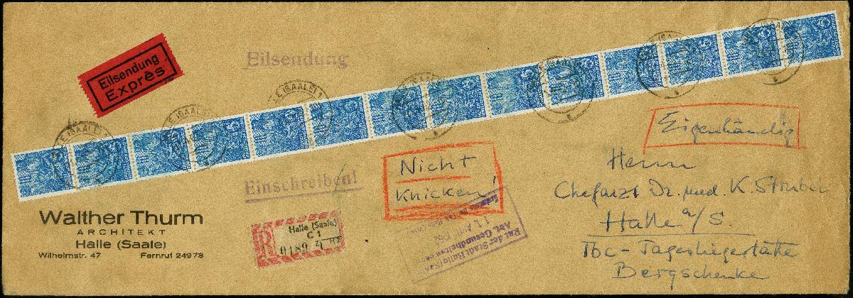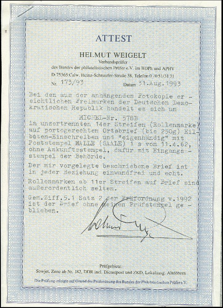 | Zusatzinformationen und Suchstichworte: | 367. Auktion Heinrich Köhler 25. - 29. September 2018 Los 2012 1957, Fünfjahrplan 10 Pfg. im senkrechten 14er-Rollenmarkenstreifen als portogerechte Mehrfachfrankatur auf R-Eilboten-Eingenhändig-Ortsbrief der 2. Gewichtsstufe im Langformat aus "HALLE 11.4.62" mit Eingangsstempel der Stadt Halle vom gleichen Tag, gute Gesamterhaltung, äußerst seltene Verwendung, Fotoattest Weigelt BPP (1993) Zuschlag 160,00 EUR |