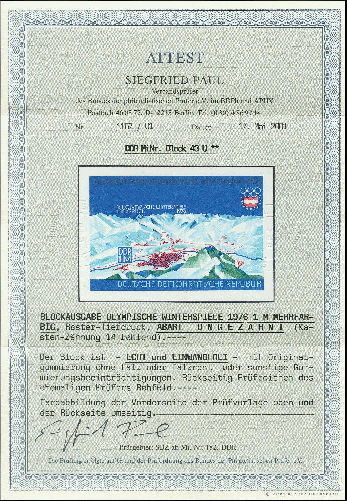 | Zusatzinformationen und Suchstichworte: | 367. Auktion Heinrich Köhler 25. - 29. September 2018 Los 2015 1975, Olympische Winterspiele Innsbruck-Block ungezähnt, postfrisch, tadellos, sign. Rehfeld und Fotoattest Paul BPP (2001) (Mi. 1.000,-) Zuschlag 500,00 EUR |