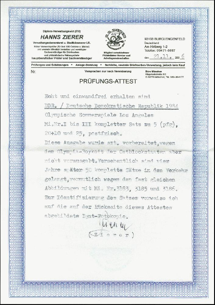 | Zusatzinformationen und Suchstichworte: | 367. Auktion Heinrich Köhler 25. - 29. September 2018 Los 2016 Nicht ausgegeben: 1984, Olympische Sommerspiele Los Angeles 5-25 Pfg. kpl., postfrisch, tadellos, sehr seltener Satz, Fotoattest Zierer (2006) (Mi. 13.000,-) Zuschlag 3.800,00 EUR |