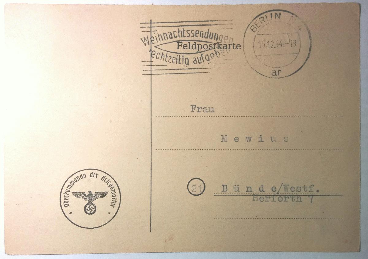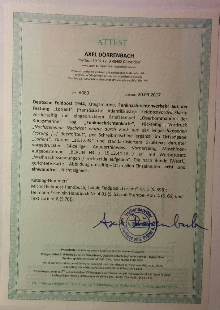 | Zusatzinformationen und Suchstichworte: | Funknachrichtenkarte Festung Lorient vom 15.12.1944 |