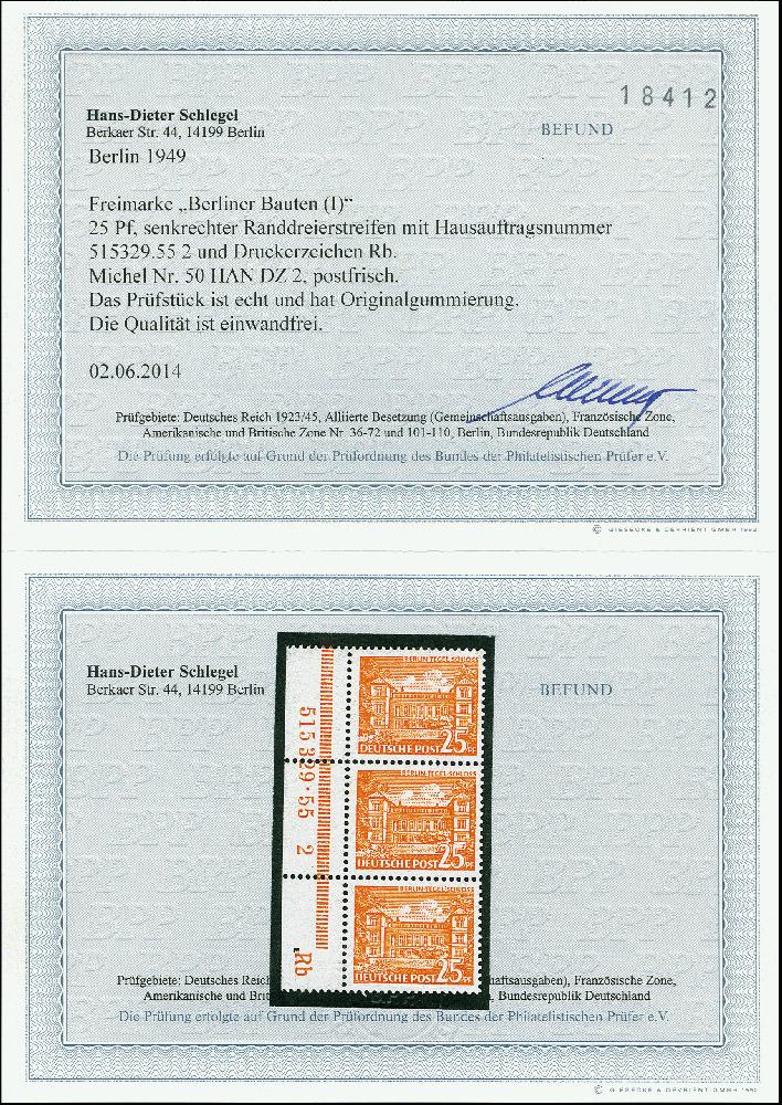 | Zusatzinformationen und Suchstichworte: | 367. Auktion Heinrich Köhler 25. - 29. September 2018 Los 2074 25 im senkrechten 3er-Randstreifen mit HAN "515329.55 2" und Druckerzeichen "Rb", postfrisch, im Rand mit Hefterloch, sonst tadellos, selten, Fotobefund D. Schlegel BPP (2014) (Mi. 950,-) Zuschlag 380,00 EUR |