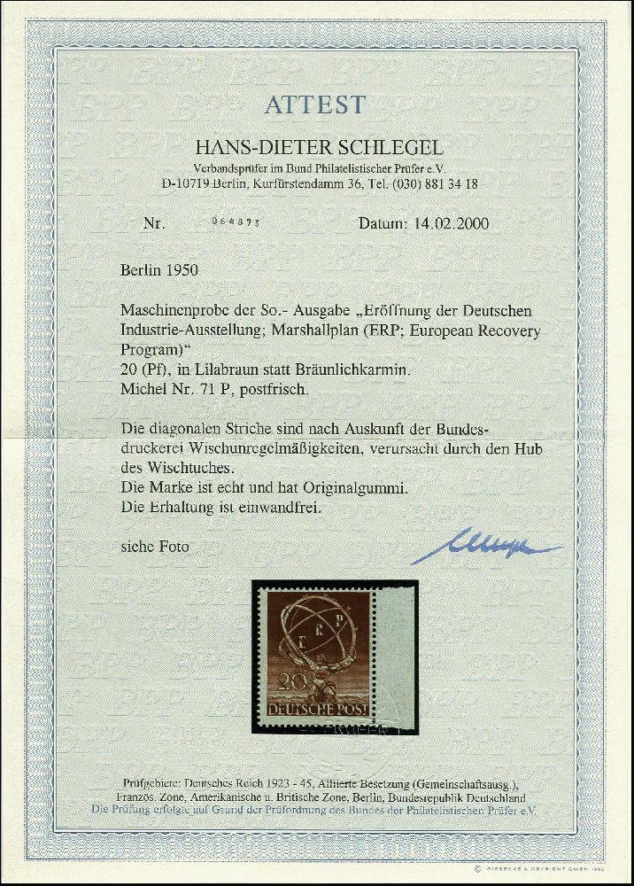 | Zusatzinformationen und Suchstichworte: | 367. Auktion Heinrich Köhler 25. - 29. September 2018 Los 2102 1950, ERP 20 Pfg. Probedruck in schwärzlichgelbbraun, Randstück, postfrisch, Fotoattest Schlegel BPP (2000) (Mi. 1.000,-) Zuschlag 150,00 EUR |
