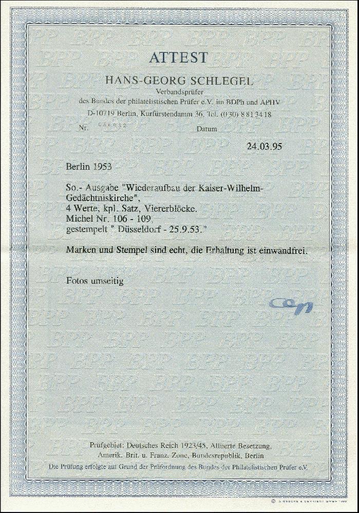| Zusatzinformationen und Suchstichworte: | 367. Auktion Heinrich Köhler 25. - 29. September 2018 Los 2115 1953, Gedächtniskirche 4-30 Pfg., kpl. Viererblocksatz je mit Stempel von Düsseldorf, tadellos, Fotoattest Schlegel BPP (1995) (Mi. 920,-) Zuschlag 120,00 EUR |