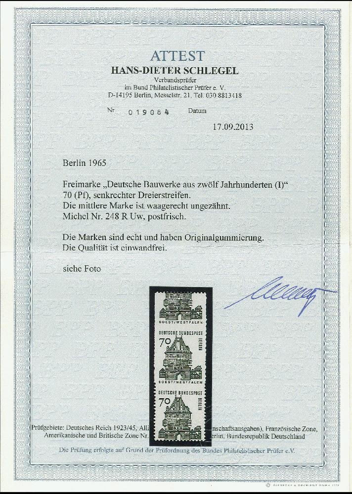 | Zusatzinformationen und Suchstichworte: | 367. Auktion Heinrich Köhler 25. - 29. September 2018 Los 2131 70 Pfg. im senkrechten 3er-Streifen, mittlere Marke waagerecht ungezähnt, postfrisch, tadellos, sehr seltene Einheit, unsigniert mit Fotoatteste Salomon BPP (1983) und D. Schlegel BPP (2013) Zuschlag 300,00 EUR |