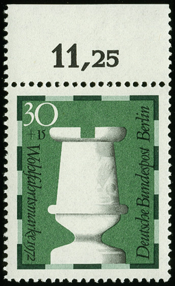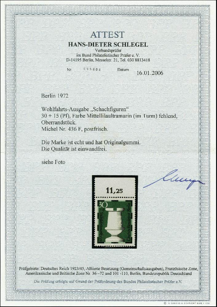 | Zusatzinformationen und Suchstichworte: | 367. Auktion Heinrich Köhler 25. - 29. September 2018 Los 2133 1972, Schachfiguren 30 Pfg. mit Abart "Farbe Mittellilaulramarin (im Turm) fehlend", Oberrandstück, postfrisch, tadellos, unsigniert mit Fotoattest D. Schlegel BPP (2006) (Mi. 600,-) Zuschlag 340,00 EUR |