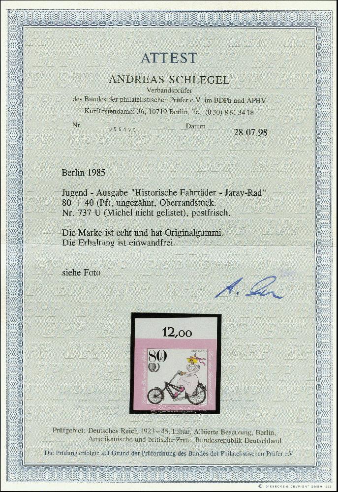 | Zusatzinformationen und Suchstichworte: | 367. Auktion Heinrich Köhler 25. - 29. September 2018 Los 2145 1985, Historische Fahrräder 80 Pfg. ungezähnt mit Oberrand, postfrisch, tadellos, sehr seltene Marke, bisher nicht gelistet, unsigniert mit Fotoattest A. Schlegel BPP (1998) Zuschlag 600,00 EUR |
