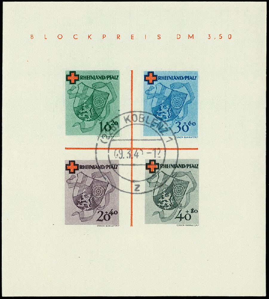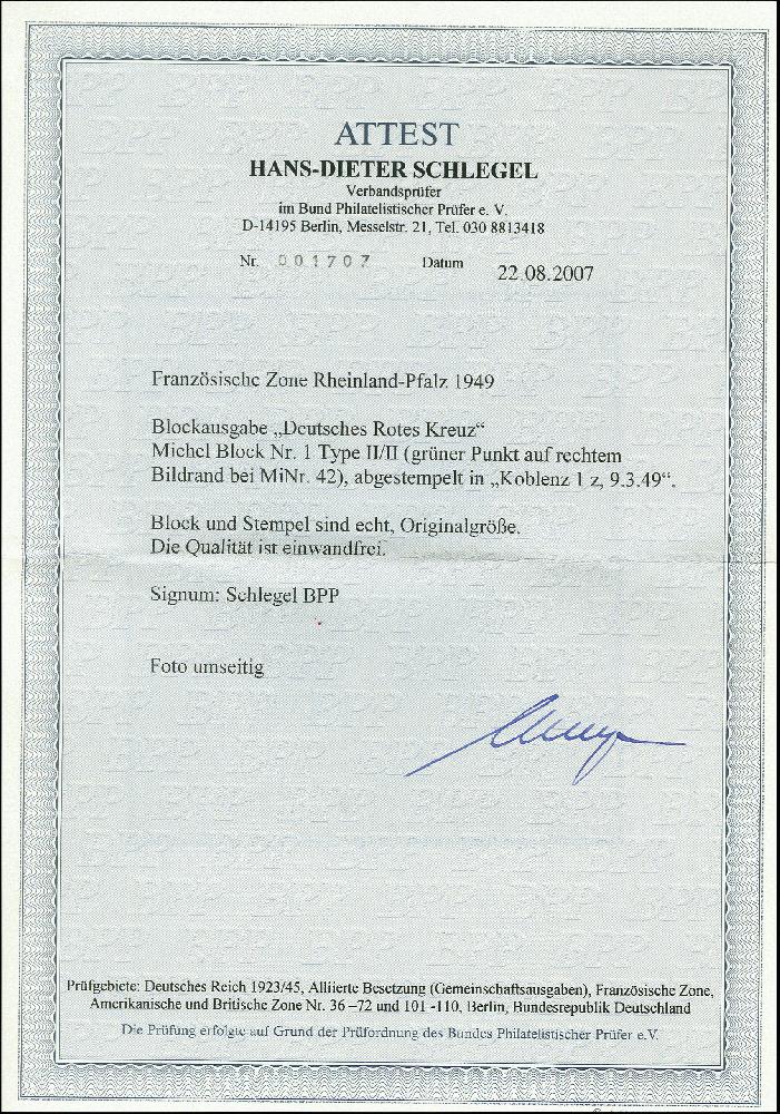 | Zusatzinformationen und Suchstichworte: | 367. Auktion Heinrich Köhler 25. - 29. September 2018 Los 2184 Rotes Kreuz-Block, Type II/II mit zentrischem Stempel "KOBLENZ 9.3.49" tadellos, sign. Schlegel BPP und Fotoattest D. Schlegel BPP (2007) (Mi. 1.400,-) Zuschlag 380,00 EUR |