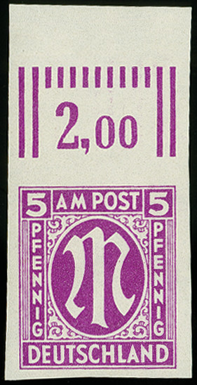 | Zusatzinformationen und Suchstichworte: | 367. Auktion Heinrich Köhler 25. - 29. September 2018 Los 2209 Deutscher Druck: Probedruck 5 Pfg. purpur auf normalem Papier, ungezähntes Oberrandstück, postfrisch, tadellos, unsigniert mit Fotoattest Hettler BPP (2006) (Mi. 1.200,-) Zuschlag 220,00 EUR |