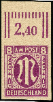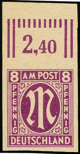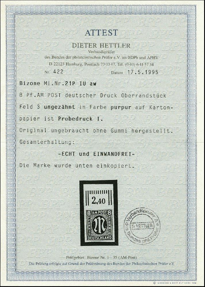 | Zusatzinformationen und Suchstichworte: | 367. Auktion Heinrich Köhler 25. - 29. September 2018 Los 2210 Probedruck 8 Pfg. purpur auf Kartonpapier ohne Gummierung, ungezähntes Oberrandstück, tadellos, unsigniert mit Fotoattest Hettler BPP (1995) (Mi. 1.900,-) Zuschlag 460,00 EUR |