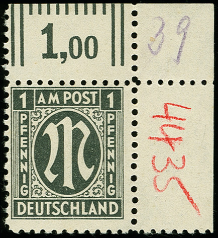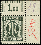 | Zusatzinformationen und Suchstichworte: | 367. Auktion Heinrich Köhler 25. - 29. September 2018 Los 2216 Deutscher Druck: 1945, 1 Pfg. aus der rechten oberen Bogenzähler mit handschritlicher Bogenzählnummer "4435" in Rot, postfrisch, tadellos, Fotobefund Hettler BPP (2001) (Mi. 800,-) Zuschlag 200,00 EUR |