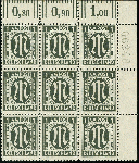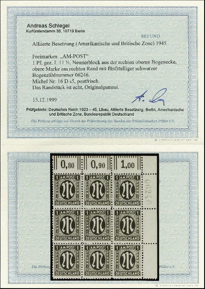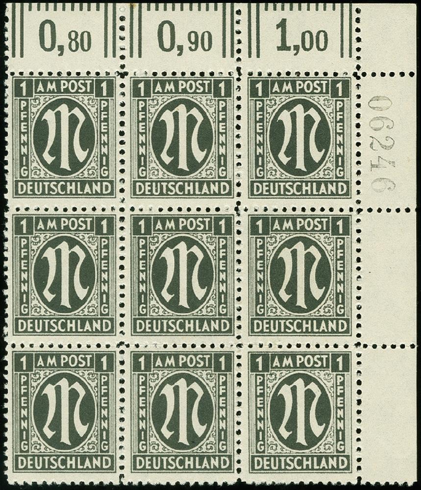 | Zusatzinformationen und Suchstichworte: | 367. Auktion Heinrich Köhler 25. - 29. September 2018 Los 2218 Deutscher Druck: 1945, 1 Pfg. gez. L 11 1/2 im 9er-Block aus der rechten oberen Bogenecke mit fünfstelliger schwarzer Bogenzählnummer, postfrisch, tadellos, Fotobefund A. Schlegel BPP (1999) (Mi. 1.500,-) Zuschlag 300,00 EUR |