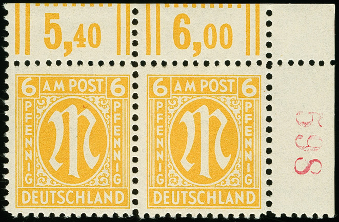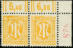 | Zusatzinformationen und Suchstichworte: | 367. Auktion Heinrich Köhler 25. - 29. September 2018 Los 2224 6 Pfg. gez. L 11 1/2 im waagerechten Paar aus der rechten oberen Bogenecke mit dreistelliger Bogenzählnummer in Rot, postfrisch, tadellos, Fotoattest Hettler BPP (2007) (Mi. 750,-) Zuschlag 200,00 EUR |