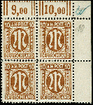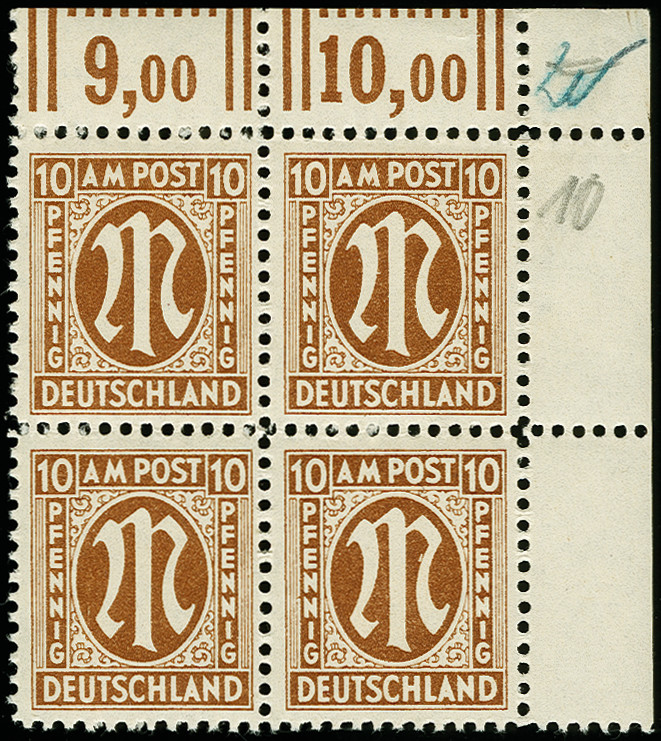 | Zusatzinformationen und Suchstichworte: | 367. Auktion Heinrich Köhler 25. - 29. September 2018 Los 2227 10 Pfg. gez. L 11 1/2 im Viererblock aus der rechten oberen Bogenecke ohne Bogenzählnummer, postfrisch, tadellos, Fotoattest A. Schlegel BPP (2008) (Mi. 6.000,-) Ausruf 1.000,00 EUR |