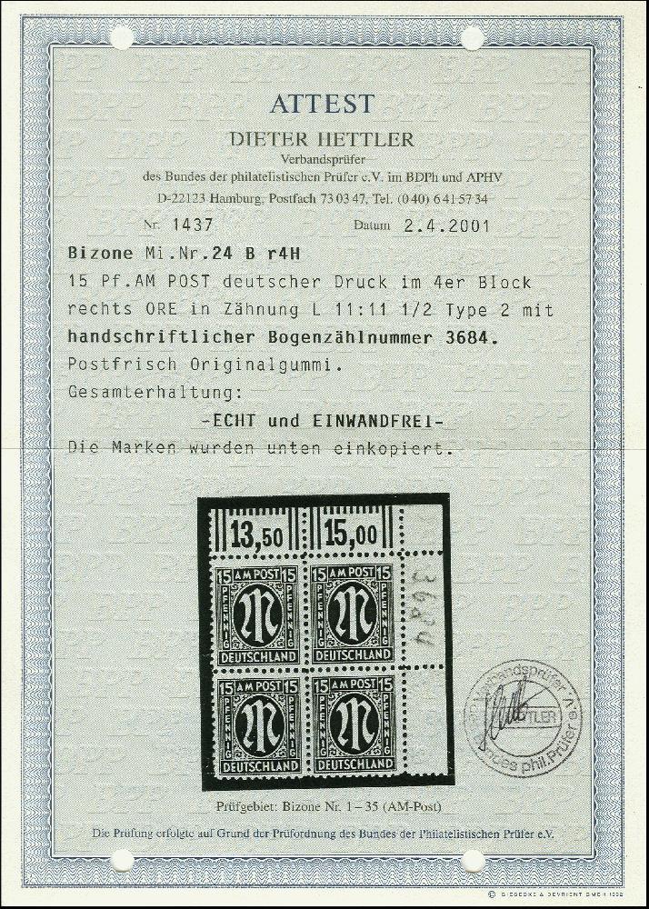 | Zusatzinformationen und Suchstichworte: | 367. Auktion Heinrich Köhler 25. - 29. September 2018 Los 2232 15Pfg. gez. L 11:11 1/2 im Viererblock aus der rechten oberen Bogenecke mit handschriftlicher vierstelliger Bogenzählnummer in Rot, postfrisch, tadellos, Fotoattest Hettler BPP (2001) (Mi. 800,-) Ausruf 200,00 EUR |
