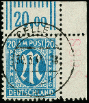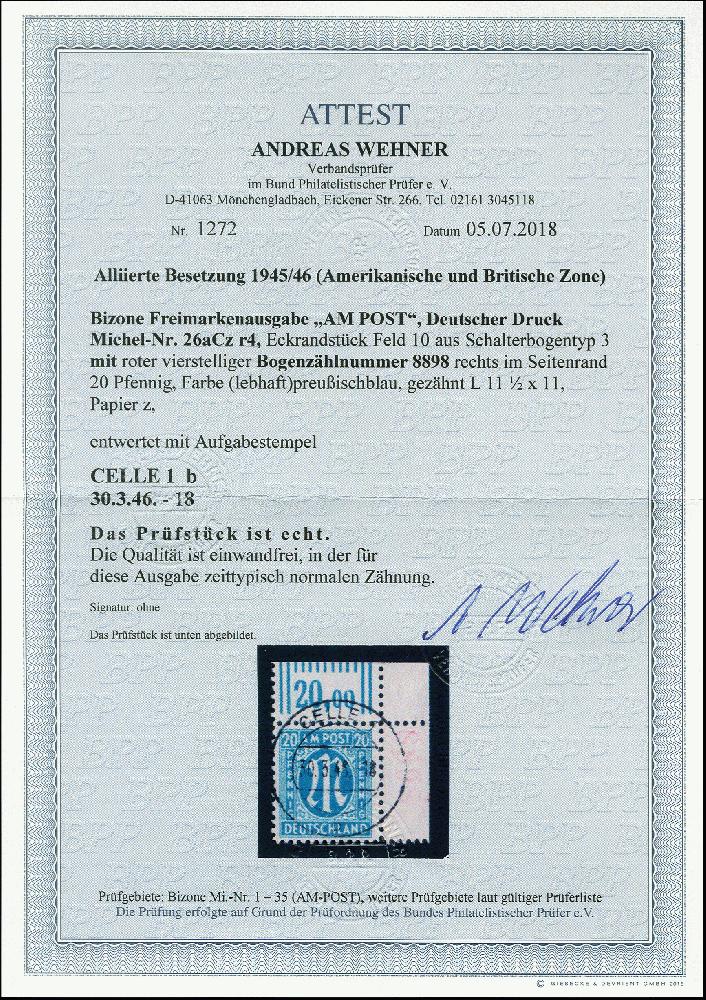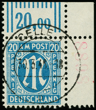 | Zusatzinformationen und Suchstichworte: | 367. Auktion Heinrich Köhler 25. - 29. September 2018 Los 2236 20 Pfg. preußischblau, gezähnt L11½:11 aus der rechten oberen Bogenecke mit roter vierstelliger Bogenzählnummer "8898", gestempelt "CELLE 30.3.46", normale Zähnung, Fotoattest Wehner BPP (2018) (Mi. 1.100,-) Ausruf 240,00 EUR |