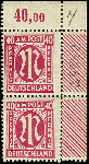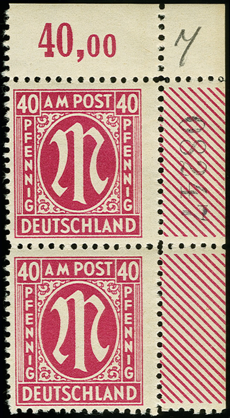 | Zusatzinformationen und Suchstichworte: | 367. Auktion Heinrich Köhler 25. - 29. September 2018 Los 2243 40 Pfg. rosakarmin gez. L 11:11 1/2 im senkrechten Paar aus der rechten oberen Bogenecke mit schwarzer fünfstelliger Bogenzählnummer, postfrisch, tadellos, Fotoattest Hettler BPP (1999) (Mi. 900,-) Ausruf 200,00 EUR |