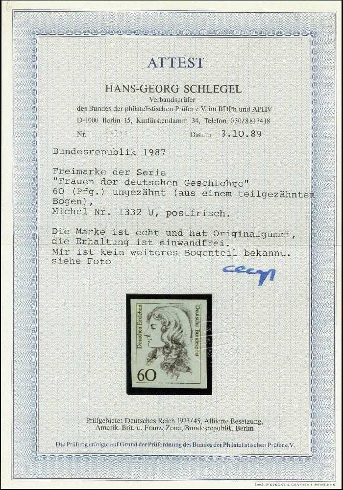 | Zusatzinformationen und Suchstichworte: | 367. Auktion Heinrich Köhler 25. - 29. September 2018 Los 2476 Dorethea Erxleben 60 Pfg. ungezähnt, postfrisch, tadellos, seltene Marke, unsigniert mit Fotoattest Schlegel BPP (1989) (Mi. 2.500,-) Zuschlag 600,00 EUR |