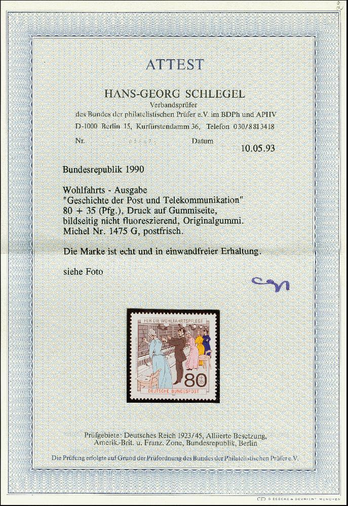 | Zusatzinformationen und Suchstichworte: | 367. Auktion Heinrich Köhler 25. - 29. September 2018 Los 2480 1990, Wohlfahrt 80 Pfg. mit Abart "Druck auf der Gummiseite", postfrisch, tadellos, unsigniert mit Fotoattest Schlegel BPP (1993) (Mi. 600,-) Zuschlag 240,00 EUR |