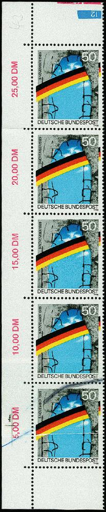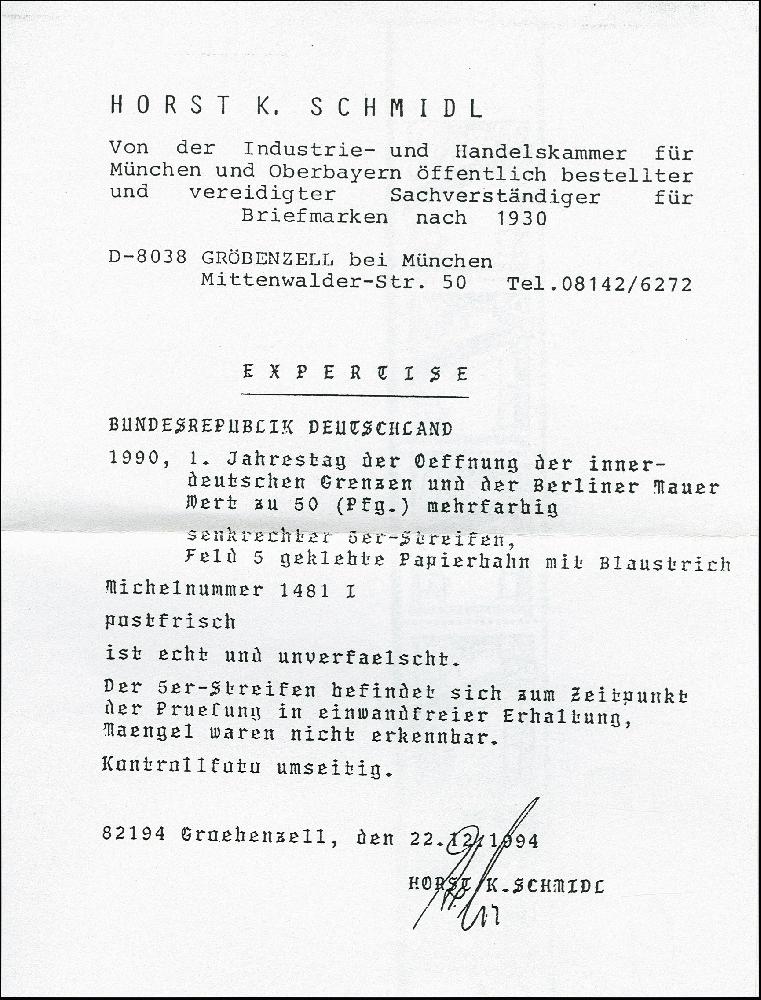 | Zusatzinformationen und Suchstichworte: | 367. Auktion Heinrich Köhler 25. - 29. September 2018 Los 2481 1. Jahrestag der Öffnungs der innerdeutschen Grenzen und der Berliner Mauer 50 Pfg. im senkrechten 5er-Streifen mit Bogenrändern (obere Marke umgefaltet), die beiden unterer Marker mit Abart "Druck auf geklebter Papierbahn" mit Buntstiftkennzeichnung der Makulatur, postfrisch, tadellos, Expertise Schmidl (1994) Zuschlag 120,00 EUR |