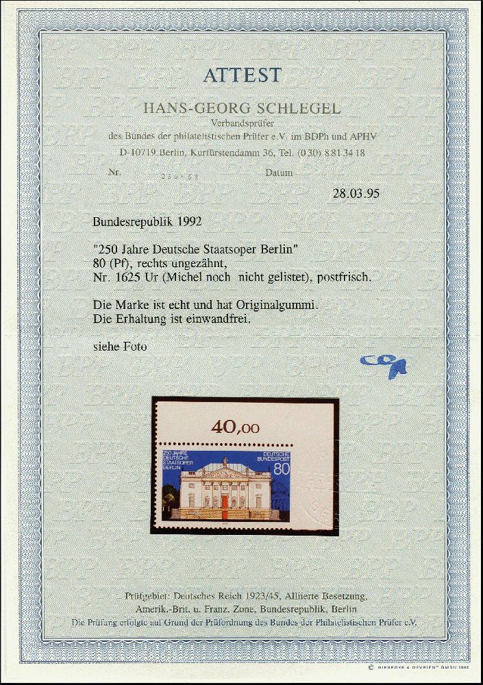 | Zusatzinformationen und Suchstichworte: | 367. Auktion Heinrich Köhler 25. - 29. September 2018 Los 2486 1992, 250 Jahre Deutsche Staatsoper 80 Pfg. aus der rechten oberen Bogenecke mit Abart "rechts ungezähnt", postfrisch, tadellos, Fotoattest Schlegel BPP (1995) Zuschlag 240,00 EUR |