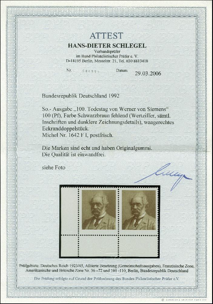 | Zusatzinformationen und Suchstichworte: | 367. Auktion Heinrich Köhler 25. - 29. September 2018 Los 2488 1992, 100. Todestag von Werner von Siemens 100 Pfg. mit Abart "Farbe Schwarzbraun fehlend (Wertziffer, sämtliche Inschriften und dunklere Zeichnungsdetails)" im waagerechten Paar aus der linken unteren Bogenecke, postfrisch, tadellos, Fotoattest D. Schlegel BPP (2006) (Mi. 300,-) Ausruf 80,00 EUR |