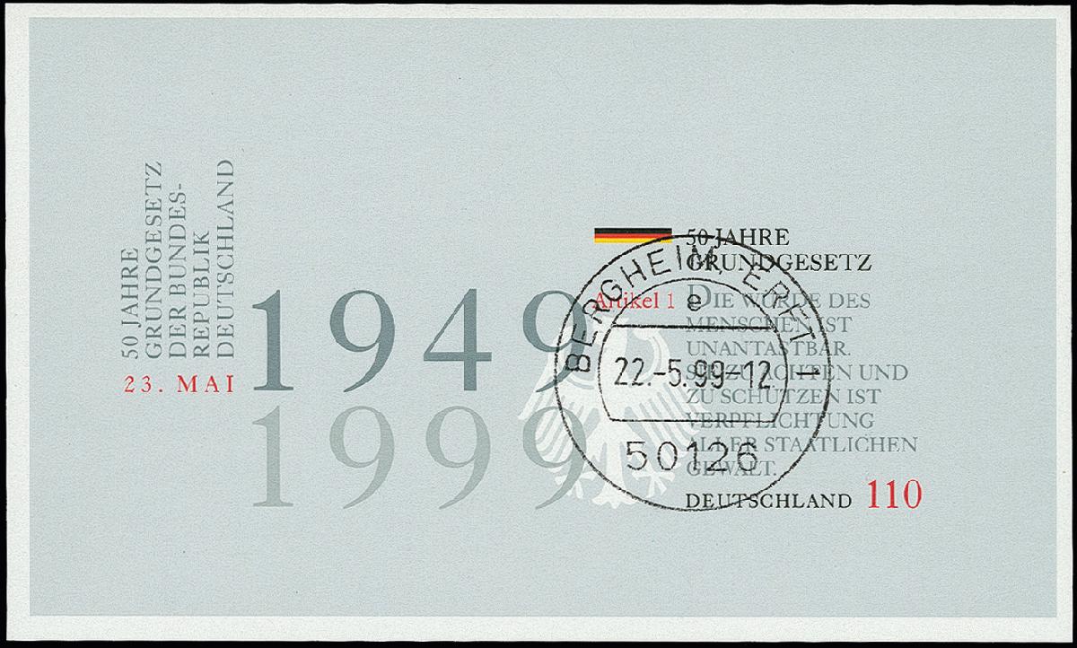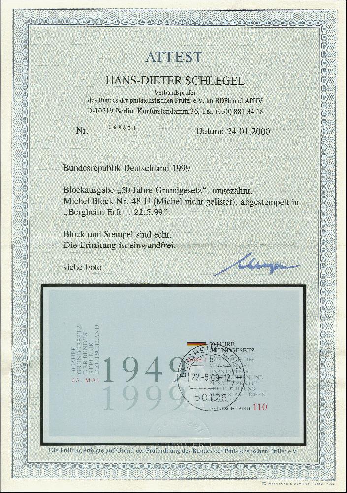 | Zusatzinformationen und Suchstichworte: | 367. Auktion Heinrich Köhler 25. - 29. September 2018 Los 2501 1999, 50 Jahre Grundgesetz-Block ungezähnt, sauber gestempelt, tadellos, Fotoattest D. Schlegel BPP (2000) Zuschlag 410,00 EUR |