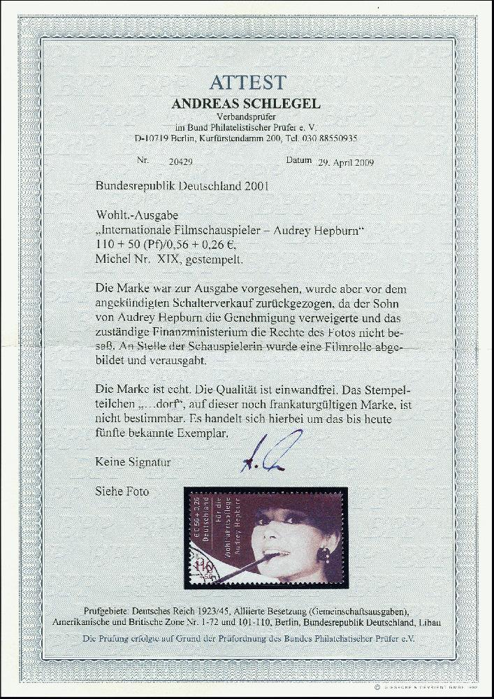 | Zusatzinformationen und Suchstichworte: | 367. Auktion Heinrich Köhler 25. - 29. September 2018 Los 2505 2001, Unverausgabte Audrey Hepburn 110 Pfg., sauber mit kleinem Teil eines Tagesstempels entwertet, das Motiv völlig freilassend, tadellos, eine der großen modernen Seltenheiten mit lediglich 5 bekannte Stücken, Fotoattest Schlegel BPP (2009) Zuschlag 46.000,00 EUR |