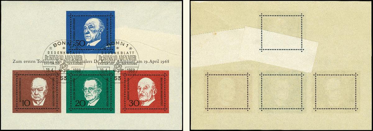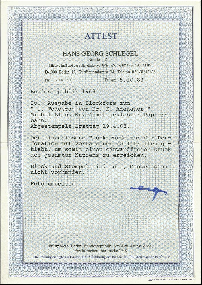 | Zusatzinformationen und Suchstichworte: | 367. Auktion Heinrich Köhler 25. - 29. September 2018 Los 2443 1968, Adenauer-Block mit Abart "Druck auf geklebter Papierbahn", entwertet mit ESST, tadellos, bei Blockausgaben eine äußerst seltene Abart, Fotoattest Schlegel BPP (1983) (Mi. 2.000,-) Zuschlag 800,00 EUR |