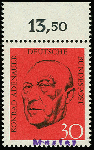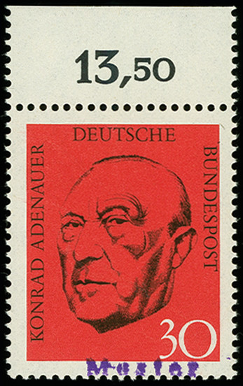 | Zusatzinformationen und Suchstichworte: | 367. Auktion Heinrich Köhler 25. - 29. September 2018 Los 2444 1968, sogenannter "Roter Adenauer" 30 Pfg. lebhaftrot/schwarz mit obligatorischem Handstempel "Muster", Oberrandstück, postfrisch, tadellos, unsigniert mit Fotoattest Schlegel BPP (1983) Zuschlag 3.800,00 EUR |