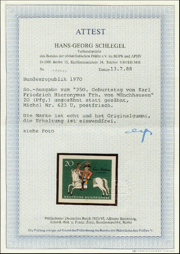 | Zusatzinformationen und Suchstichworte: | 367. Auktion Heinrich Köhler 25. - 29. September 2018 Los 2446 1970, 250. Geburtstag von Karl-Friedrich Hieronymus Frh. von Münchhausen 20 Pfg. ungezähnt, postfrisch, tadellos, unsigniert mit Fotoattest Schlegel BPP (1988) (Mi. 600,-) Zuschlag 240,00 EUR |