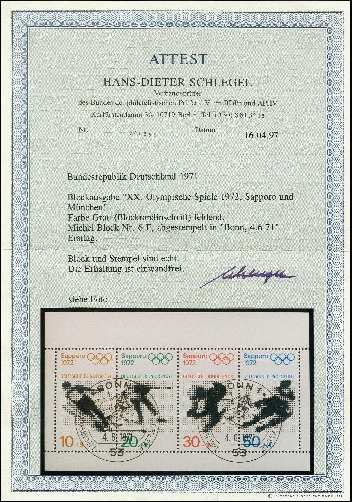 | Zusatzinformationen und Suchstichworte: | 367. Auktion Heinrich Köhler 25. - 29. September 2018 Los 2447 Olympia-Block mit Abart "Farbe Grau (Blockrandinschrift) fehlend", entwertet mit ESST, tadellose Erhaltung, einer der seltensten Abarten bei den Blockausgaben, große Bund-Seltenheit, Fotoattest D. Schlegel BPP (1997) Zuschlag 2.600,00 EUR |
