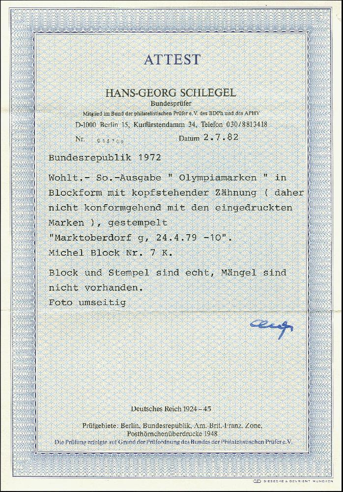 | Zusatzinformationen und Suchstichworte: | 367. Auktion Heinrich Köhler 25. - 29. September 2018 Los 2449 1972, Olympiablock mit kopfstehender Zähnung (daher nicht konformgehend mit den eingedruckten Marken), sauber entwertet mit Tagesstempel "MARKTOBERDORF 24.4.79", tadellos, sehr selten, nur wenige Exemplare bekannt, Fotoattest Schlegel BPP (1982) (Mi. 5.000,-) Zuschlag 3.000,00 EUR |