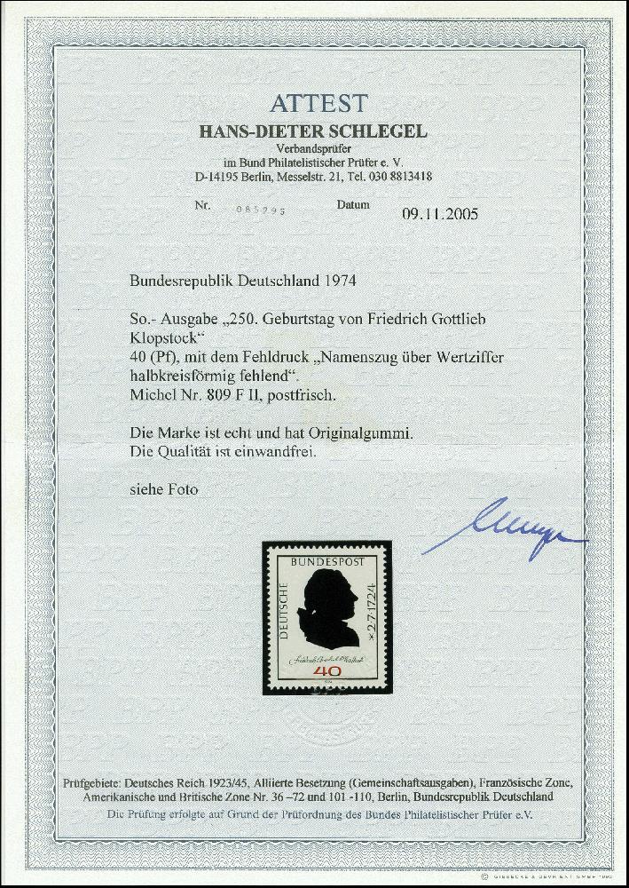 | Zusatzinformationen und Suchstichworte: | 367. Auktion Heinrich Köhler 25. - 29. September 2018 Los 2457 1974, 250. Geburtstag von Friedrich Gottlieb Klopstock 40 Pfg. mit Abart "Namenszug über Wertziffer halbkreisförmig fehlend", postfrisch, tadellos, unsigniert mit Fotoattest D. Schlegel BPP (2005) (Mi. 300,-) Zuschlag 80,00 EUR |