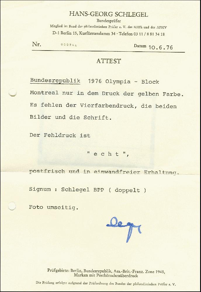 | Zusatzinformationen und Suchstichworte: | 367. Auktion Heinrich Köhler 25. - 29. September 2018 Los 2460 1976, Olympia-Block mit Abart "Farben Schwarz, Gelblichrot, Mittelblau und Weißblau fehlend (nur hellgelber Untergrund der 30 Pfg. vorhanden)", postfrisch, tadellos, sehr selten, Fotoattest Schlegel BPP (1976) (Mi. 6.000,-) Zuschlag 1.800,00 EUR |