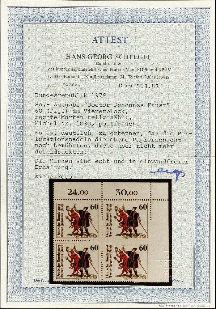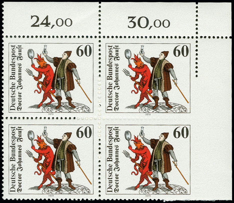| Zusatzinformationen und Suchstichworte: | 367. Auktion Heinrich Köhler 25. - 29. September 2018 Los 2461 1979, Docktor Johannes Faust 60 Pfg. im Viererblock aus der rechten oberen Bogenecke, rechte obere Marke unten ungezähnt und untere rechte Marke oben und rechts ungezähnt (jeweils sind zum Teil Abdrücke der Perforationsnadeln sichtbar), postfrisch, tadellos, dekorative und seltene Einheit, Fotoattest Schlegel BPP (1987) Zuschlag 340,00 EUR |