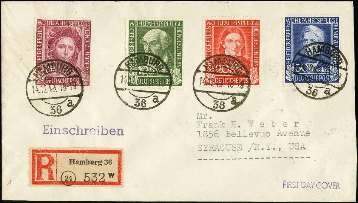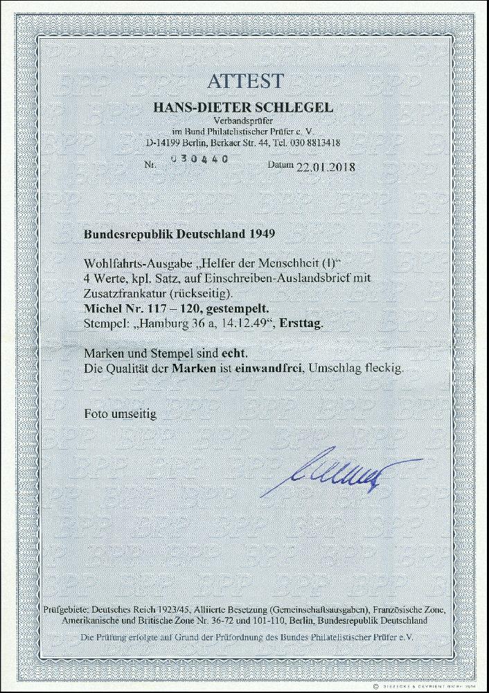 | Zusatzinformationen und Suchstichworte: | 367. Auktion Heinrich Köhler 25. - 29. September 2018 Los 2364 1949, Wohlfahrt 8-30 Pfg. kpl. auf R-FDC mit rückseitiger Zufrankatur 2 Pfg. von "HAMBURG 14.12.49" via New York nach Syracuse mit Ankunftsstempel, Umschlag links etwas fleckig, Marken tadellos, Fotoattest D. Schlegel BPP (2018) (Mi. 1.700.-) Zuschlag 360,00 EUR |