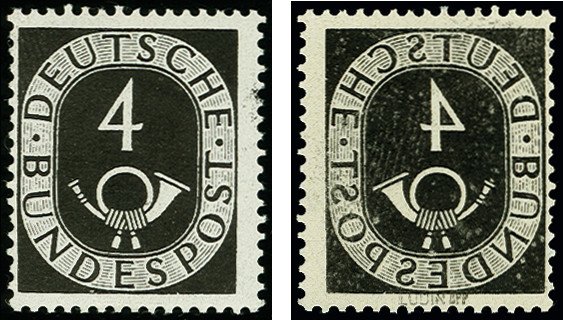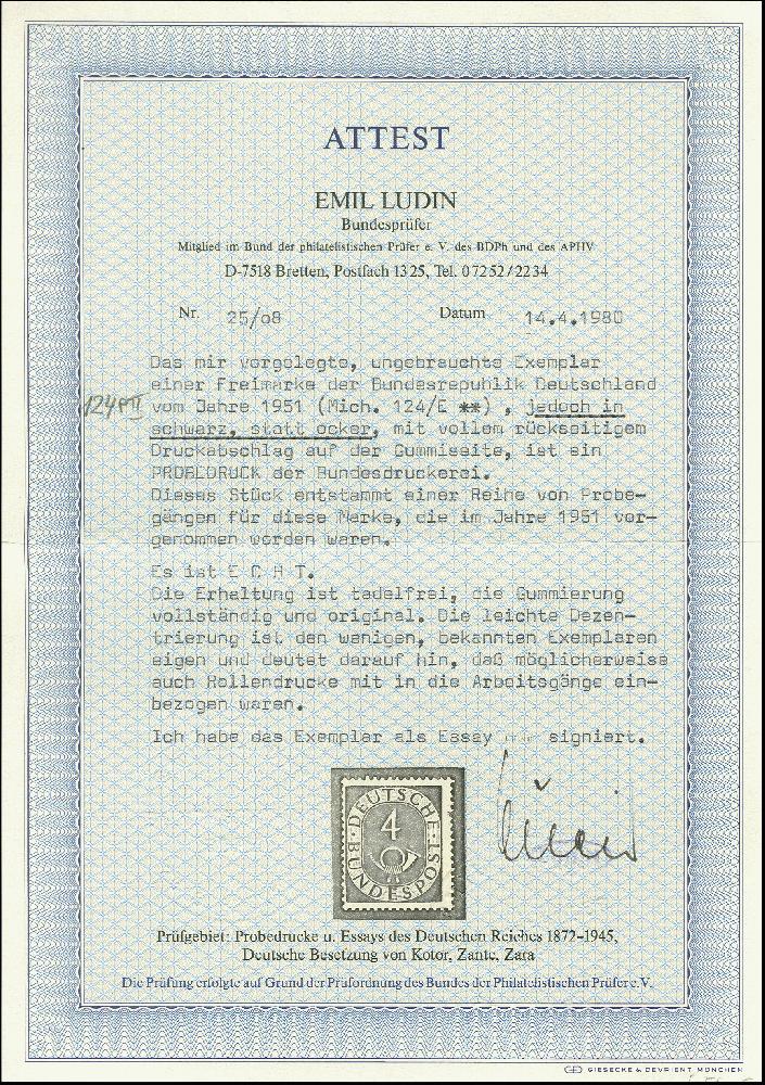 | Zusatzinformationen und Suchstichworte: | 367. Auktion Heinrich Köhler 25. - 29. September 2018 Los 2366 Posthorn, Probedruck 4 Pfg. in Schwarz, gezähnt mit rückseitig kpl. Abklatsch, postfrisch, tadellos, sign. Ludin BPP mit Fotoattest (1980) (Mi. 1.200,-) Zuschlag 250,00 EUR |