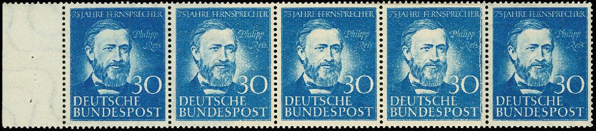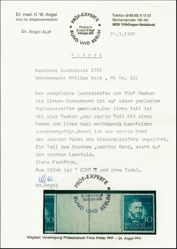 | Zusatzinformationen und Suchstichworte: | 367. Auktion Heinrich Köhler 25. - 29. September 2018 Los 2392 Philipp Reis 30 Pfg. im waagerechten 5er-Streifen mit Bogenrand links, die mittleren drei Werte mit Abart "Druck auf geklebter Papierbahn", postfrisch, tadellos, sehr selten, unsigniert mit Fotoattest Dr. Angel (1982) Zuschlag 800,00 EUR |