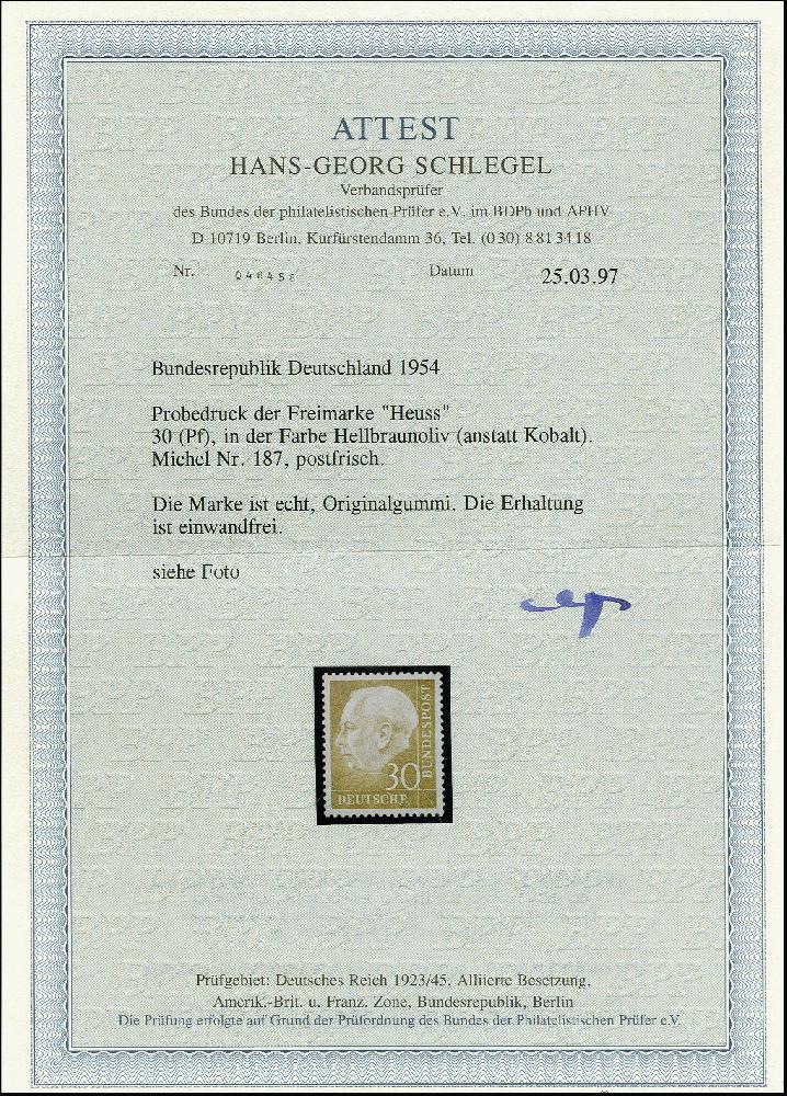 | Zusatzinformationen und Suchstichworte: | 367. Auktion Heinrich Köhler 25. - 29. September 2018 Los 2400 30 Pfg., Probedruck in hellbraunoliv, postfrisch mit leichter Bleistiftnummer, tadellos, unsigniert mit Fototattest Schlegel BPP (1997) (Mi. 1.200,-) Zuschlag 420,00 EUR |