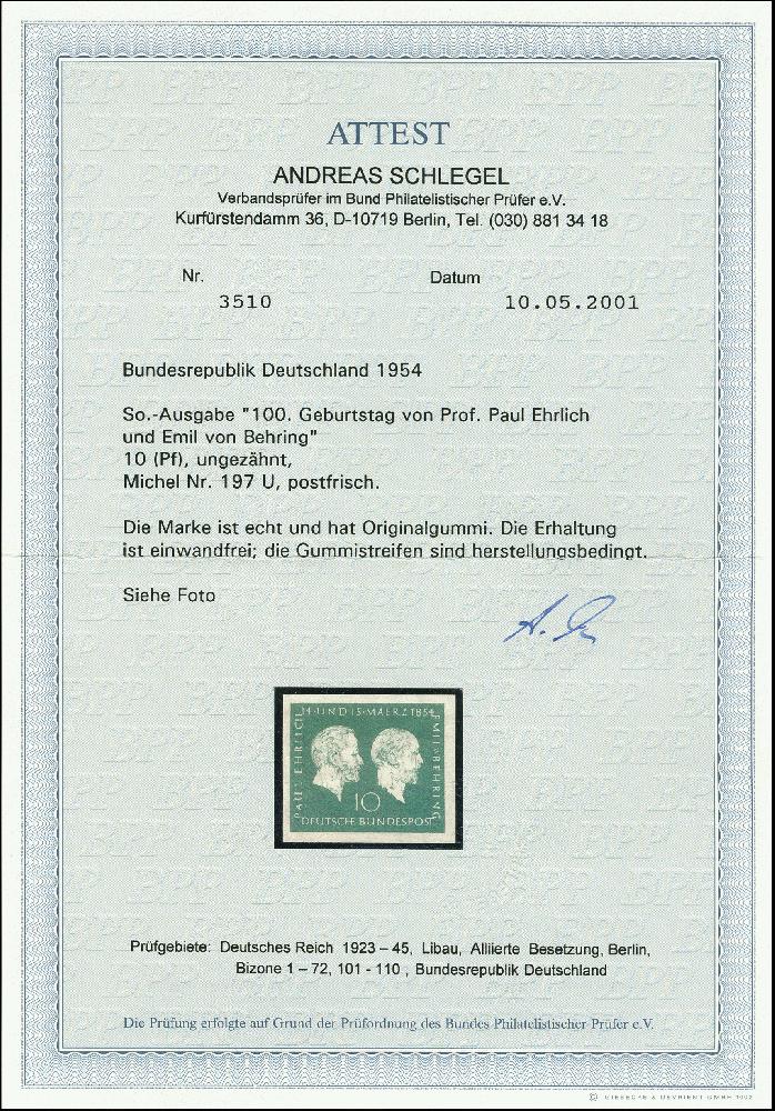 | Zusatzinformationen und Suchstichworte: | 367. Auktion Heinrich Köhler 25. - 29. September 2018 Los 2405 1954, 100. Geburtstag von Prof. Ehrlich und Emil von Behring 10 Pfg. ungezähnt, postfrisch mit herstellungsbingten Gummistreifen, tadellos, unsigniert mit Fotoattest A. Schlegel BPP (2001) (Mi. 850,-) Zuschlage 340,00 EUR |